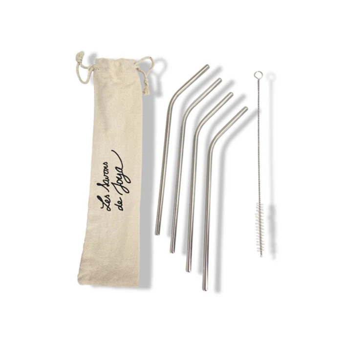 Lot de 4 pailles coudées en inox avec un goupillon pour facilité le nettoyage et sa pochette pour les ranger ou les transporter en coton Bio.
