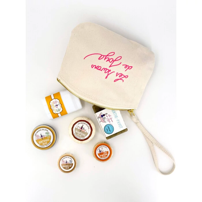 Cette pochette est composée d'un shampoing format voyage, d'un après-shampooing format découverte, d'un déodorant stick format voyage, d'un dentifrice et d'un savon au choix ainsi qu'un démaquillant solide 20grs.